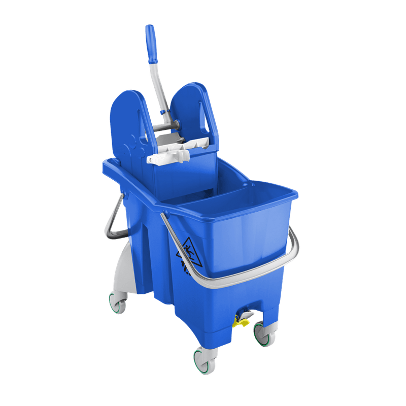 Balde duplo com duas saídas para drenagem de água. Equipado com espremedor TEC e rodas de 80mm.
