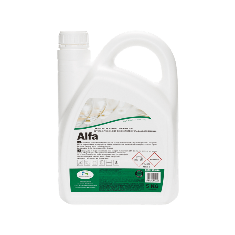 Alfa é um detergente para a lavagem manual da louça, muito concentrado, neutro e de uso geral.