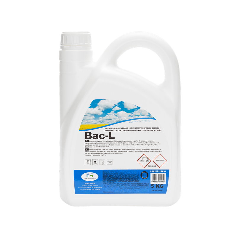 Bac-L é indicado para limpeza na indústria cárnica: utensílios de corte, bandejas, solos, paredes, etc. É eficaz, em baixas concentrações, como desinfetante e higienizante. Também funciona como desodorizante, destruindo os microrganismos do mau odor (putrefacção, decomposição, fermentação).