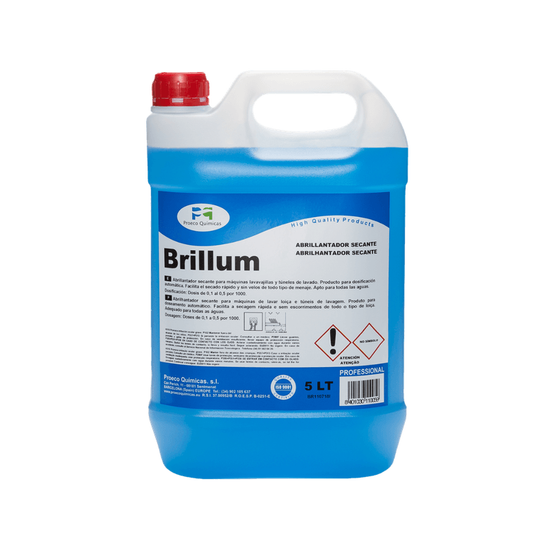 Trata-se de um aditivo para água de lavagem em máquinas de lavar louça. Brillum elimina as manchas deixadas pelo calcário, presente nas gotículas de água, e promove uma secagem rápida da louça. É de fácil solubilidade em água e forma uma espuma controlada, que desaparece rapidamente após a sua utilização. Este secante com capacidades abrilhantadoras é totalmente inócuo e biodegradável, segundo as normas vigentes actuais.
