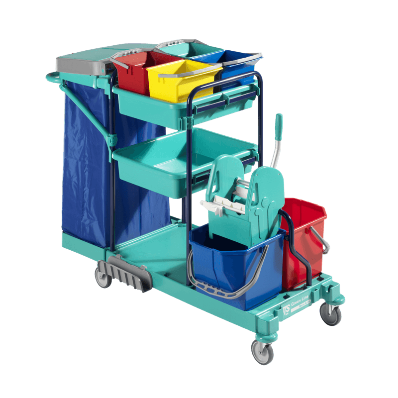 O Carro Green 460 possui uma base grande com rodas de 100mm e estrutura em metal envernizado. Está equipado com estação de lavagem de duplo balde e quatro baldes de 4L (azul, amarelo, verde e vermelho). Saco e tampa não incluídos.
