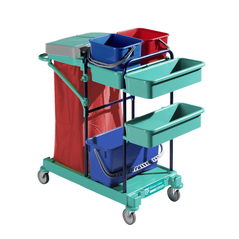 Carro Green 60 com estrutura azul. Inclui dois baldes de 6 LT (azul e vermelho) e um balde de 20 LT. O saco (120 LT) e tampa não estão incluídos.