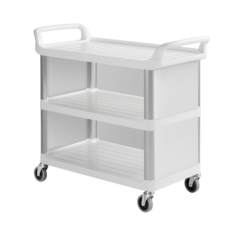 Carro com estrutura em alumínio com 3 prateleiras em polipropileno e com laterais, nas partes superiores e inferiores.
