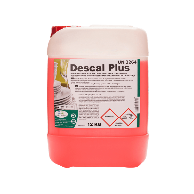 Descal Plus é indicado para a desincrustação periódica de utensílios de aço inoxidável. Elimina as incrustações de calcário, salitre e restos inorgânicos, assim como, os resíduos dos detergentes. É miscível em água, a qualquer proporção, inclusive fria. Não ataca metais, juntas de borracha, plásticos, etc.