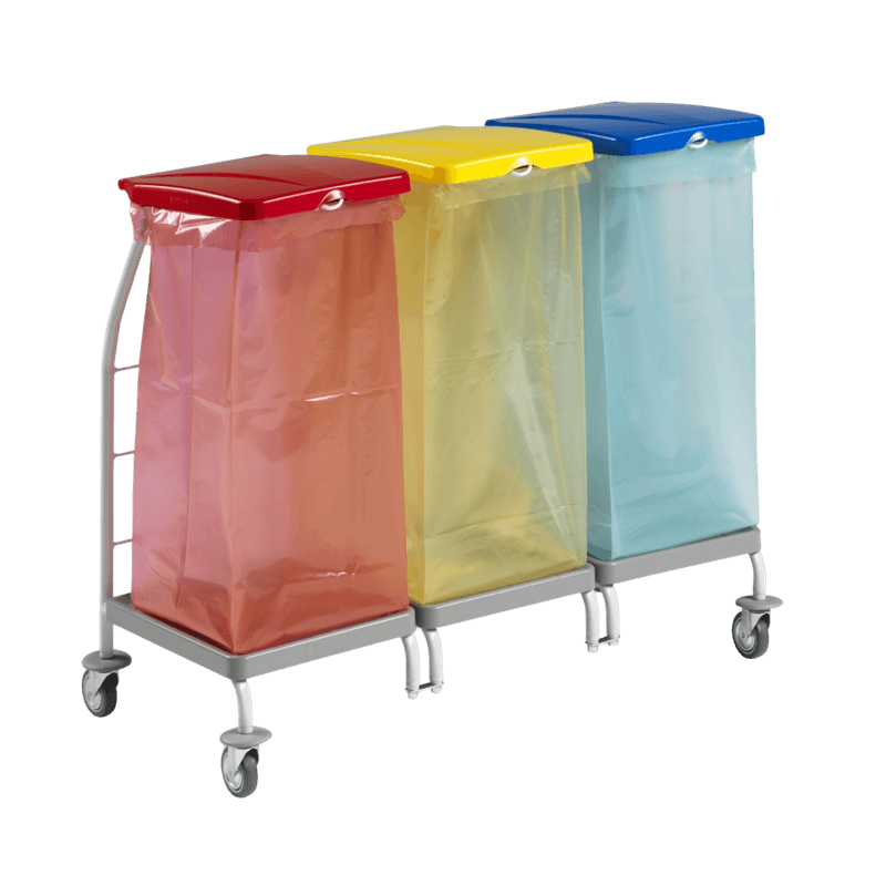 Dust para recolha do lixo sem pedais e com tampas vermelha, amarela e azul. Sacos não incluídos.