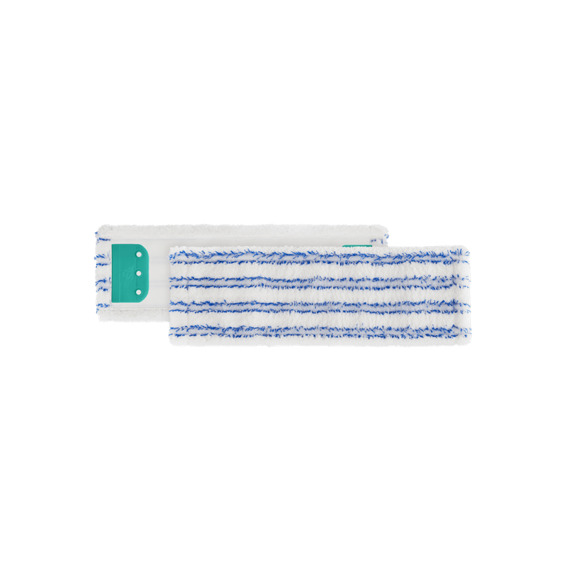 Franja de microfibra branca com estrias azuis com suporte em poliéster. Adequada para caixilho Wet System. Possui uma acção intensiva de desengorduramento da sujidade sem danificar as superfícies. Para limpeza média/baixa de sujidade ou diária.