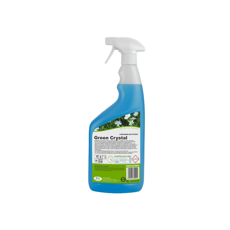 Este produto multiusos limpa sem deixar marcas de escorrimento. Green Crystal é recomendado igualmente para a limpeza de superfícies em aço inoxidável polido, superfícies esmaltadas ou de porcelana, mobiliário e equipamentos electrónicos, tais como teclados e monitores. Adequado para a limpeza de cristais e interiores de automóveis.