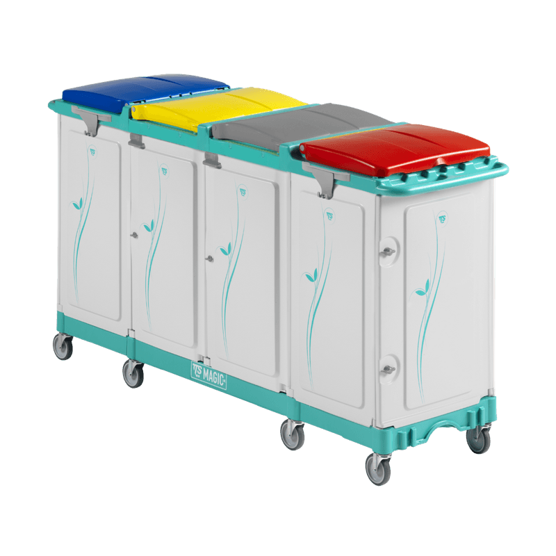 Possibilidade de aplicar um pedal. Possui dois suportes laterais para sacos de 150 LT e, dois suportes centrais para sacos com a mesma capacidade.