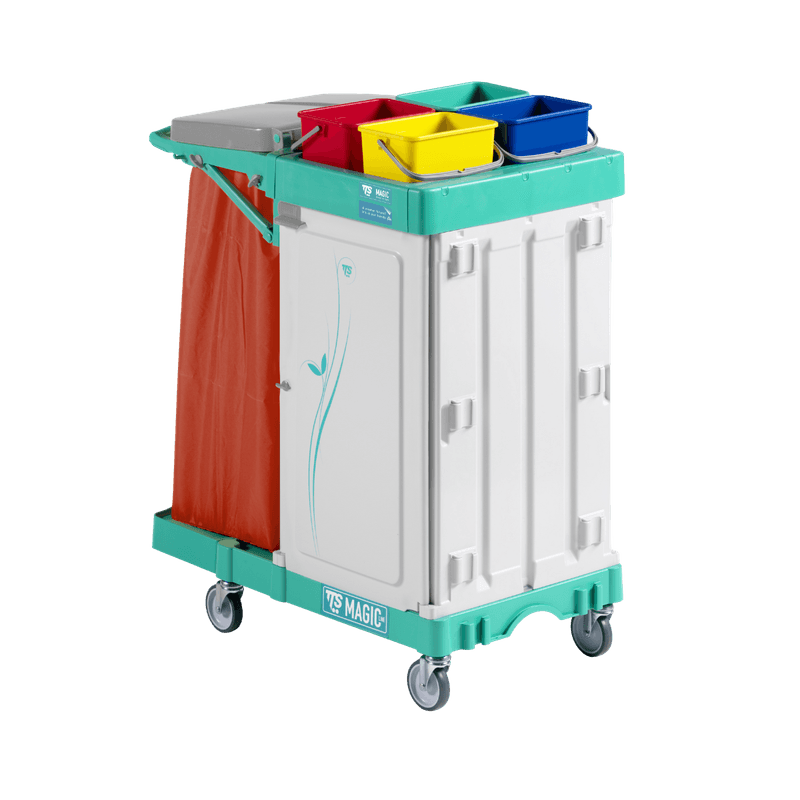 Carro Magic Line 200 Safety com base grande e rodas de 100mm. Inclui quatro baldes de 4L (azul, amarelo, vermelho e verde) e uma gaveta de 22L sem fechadura. Saco e tampa não incluídos.