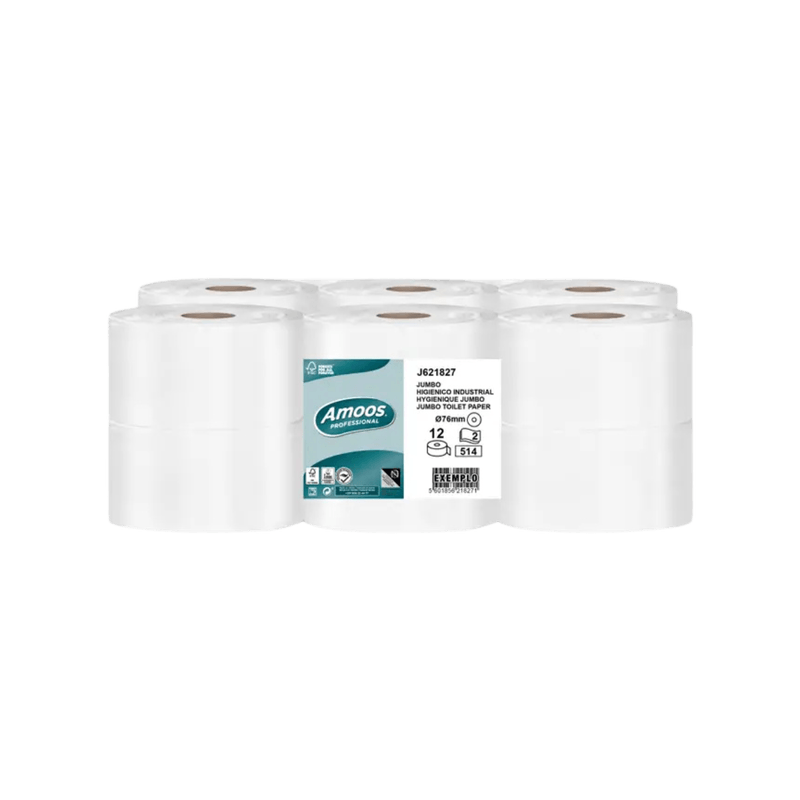 Cada rolo deste papel higiénico jumbo tem 180 metros. É fornecido em emabalagem com 12 rolos.