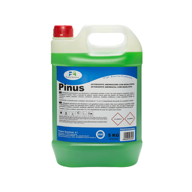 Trata-se de um detergente amoniacal com agradável perfume a pinho. Pinus é recomendado para pavimentos, paredes e superfícies vitrificadas. Não arranha nenhuma superfície, limpa e desengordura a