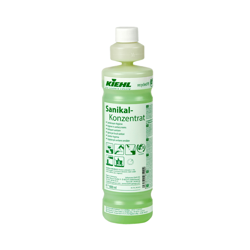 Sanikal-Concentrado é um detergente de limpeza para sanitários sem ácido e cloro, ligeiramente alcalino.