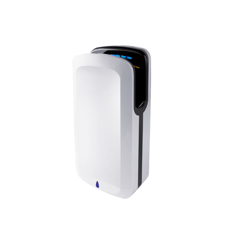 Secador de mãos ecológico, inovador, com um desenho elegante e acabamento em ABS branco.
