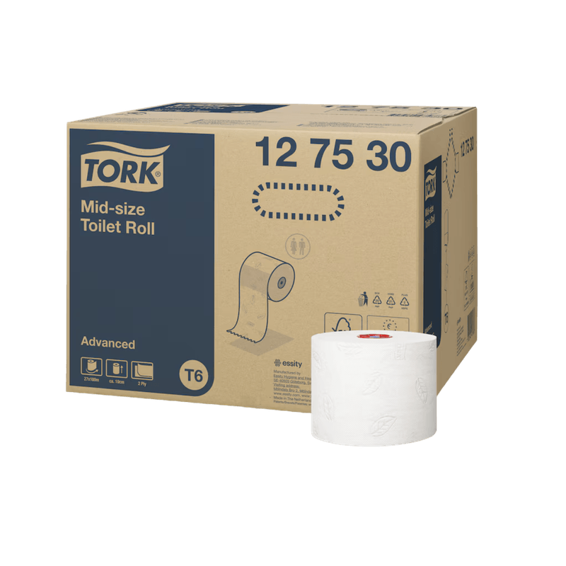 Este papel higiénico é adequado para o Tork Mid-Size Dispensador para dois Rolos de Papel Higiénico. É um sistema moderno e eficiente para casas de banho com um volume de tráfego reduzido a médio, altamente focado na satisfação dos clientes. Garante uma elevada eficiência e que os clientes têm sempre papel higiénico disponível.